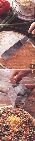 Chop chicken or beef and bell pepper ; place in mixing bowl. Add green onions, 1/2 cup of the olive slices, and 2 tablespoons of the cilantro to mixing bowl; mix gently. (Photo 1)